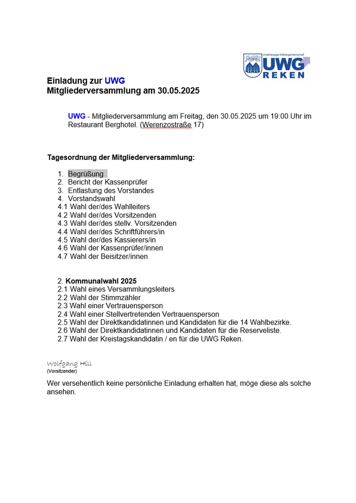 UWG - Mitgliederversammlung am 30.05.2025